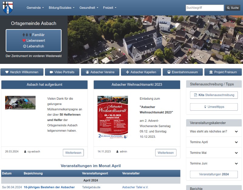ortsgemeinde-asbach.de ist das digitale Gesicht unseres Ortes und bietet u.a. Informationen zu Infrastruktur, Vereinen und Sehenswürdigkeiten.